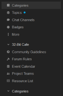 The sidebar is the center of navigation to the forum. The top section includes the Categories view, Topics view, all the live Chat Channels, and Badges page for basic navigation to start talking with other members.